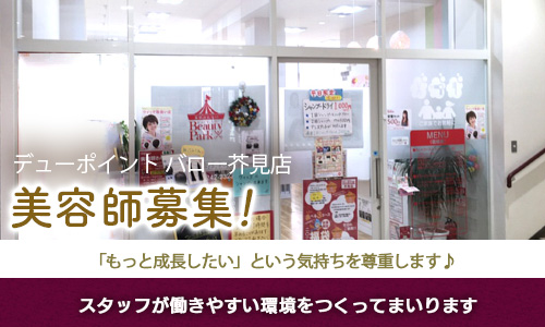 | 待遇 | ・社会保険完備 ・定期健康診断あり・有給休暇 ・歩合手当有り ・各種無料講習有り・役職手当・昇給制度有り ・提携美容学校有り ・通費規定支給(車通勤可、駐車場あり) ・技術手当有 |