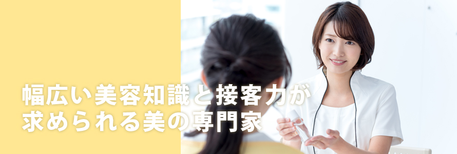具体的には、化粧品やコスメの使い方や効果などの説明と販売、メイクのアドバイス、メイクの実演、肌に関するカウンセリングなど、肌の美に様々な角度からアプローチします。そのため、化粧品や肌に関する専門的知識が必要で、メイクの実演やアドバイスをするために、メイクアップの技術も必要不可欠です。また、基本的には店頭での業務になるため、接客スキルも欠かせません。明るく社交性のある人材が求められます。