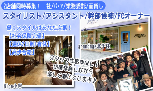 | 職種 | スタイリスト アシスタント 幹部候補 FCオーナー ※中途スタイリスト積極募集(正社員、業務委託) |