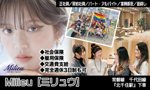 | 給与 | ■スタイリスト 【正社員】 給与 月給288,000円~++合(社内規定あり) 【業務委託】 給与 フリー45%~ 指名50%~+店販10% 【アルバイト・パート】 給与 時給1,200円~1,500円 ■アシスタント・ネイリスト 給与 時給1,113円~1,300円 ■面貸し ※条件等はお気軽にお問合せ下さい |