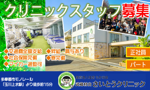 都市部と自然が共存する街、武蔵村山市。その中心部に位置する「玉川上水駅」から徒歩約15分、通勤も便利な立地にクリニックは位置しています。働くスタッフには社員寮が完備されているので、遠方からのIターン・Uターンにも最適です。車通勤が可能で、週休二日制と働きやすい労働環境も整っています。武蔵村山市での新たな生活とキャリアを、ぜひ武蔵村山さいとうクリニックでスタートさせてみませんか?