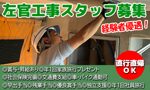 左官工事スタッフ募集中!現場は野丁場メイン◇経験者優遇☆直行・直帰OK♪家族サービスのために年1回家族旅行をプレゼント!!