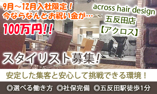 ぴったり度★★★あなたのレベル次第で収入が変わる、報酬制の働き方が好きな方に、このオファーは天職です!高収入を目指す方、指名数や売り上げに自信のある方には、 across hair design 五反田店の求人は絶好のチャンスです。また、自由な働き方を求めるフリーランスの方にも最高の環境が整っています。