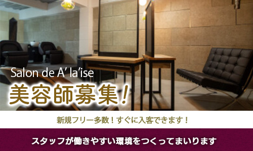 1. 高い自由度と収入の見込み当社 Salon de A’ la'iseは、完全歩合制の働き方を採用しており、一人ひとりの努力や技術が直接収入に反映されます。また、時給保証もあり、技術売上が一定額に届かない場合も安心して働くことができます。さらに、業務委託のため、自由な出勤スタイルが可能で、ライフスタイルに合わせて働けます。