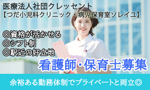 | 職種 | 【つだ小児科クリニック】 看護師(正看護師/准看護師) 【病児保育室ソレイユ】 保育士 |